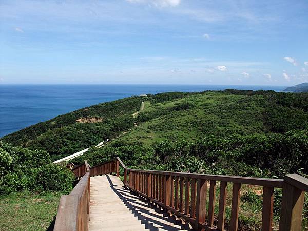 沿著木梯步道往下走,終年海風吹拂下放眼望去,依舊是綠草如茵的旭海大草原與灌木叢。